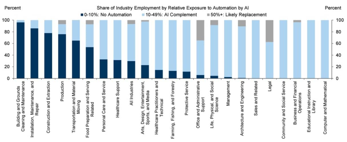 - Office and administrative support work will be impacted most by AI